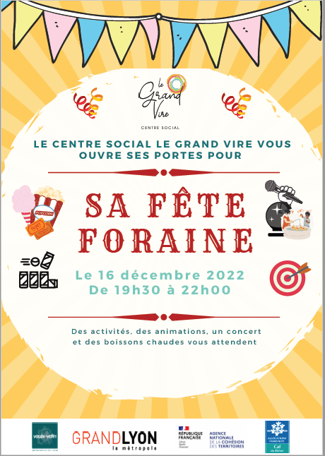 Le centre social vous accueille le vendredi 16 décembre de 19h30 à 22h00 pour sa fête foraine, ouverte à tous ! ![]()