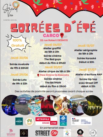 Nous vous attendons nombreux pour les activités de proximité et les soirées d’été avec au programme, musique, loto, graffiti, cinéma, cirque, sérigraphie, karaoké, hip hop…