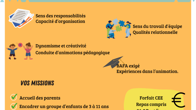 🧠 Ce qu’on attend de toi : dynamisme, créativité, sens des responsabilités et de l’organisation, travail en équipe et expérience dans l’animation !