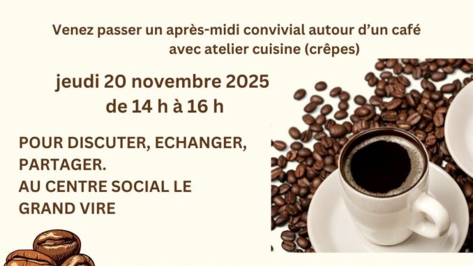 Le Centre Social Le Grand Vire vous invite à un après-midi convivial autour d’un café, le jeudi 20 novembre 2025 de 14h à 16h.
