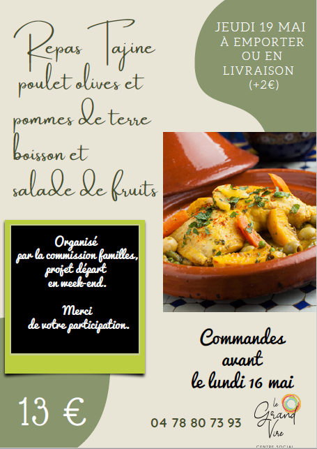 Dernière ligne droite avant le départ. La commission familles vous propose un repas à emporter ou en livraison le jeudi 19 mai. Au menu : Tajine poulet et pommes de terre boisson et salade de fruit.