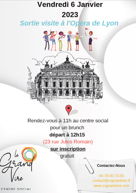 Opéra de Lyon vendredi 23 décembre 2022 Fatima AOUINE Non classé 0 Sur inscriptions. Pour plus de renseignements, contactez le centre social au 04 78 80 73 93. 40 SHARES Facebook Tweeter Envoyer par mail