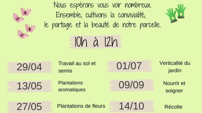 Au fil des saisons, différents ateliers vous sont proposés : semis, plantations, entretien, récolte… autant d’occasions de découvrir, d’échanger et de faire vivre collectivement cet espace.